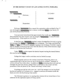 My latest example of a simple solution to what is undoubtedly a somewhat more complex interpersonal problem comes from this ruling on a petitioner's request to the Lancaster County Court for a protection order, sought by mom and dad in order to keep their daughter's ex-boyfriend away and enjoin him from being mean to her Facebook. This court order is a public record, but I redacted the names, to avoid embarrassing the individuals. Click each page image to enlarge for more comfortable reading.